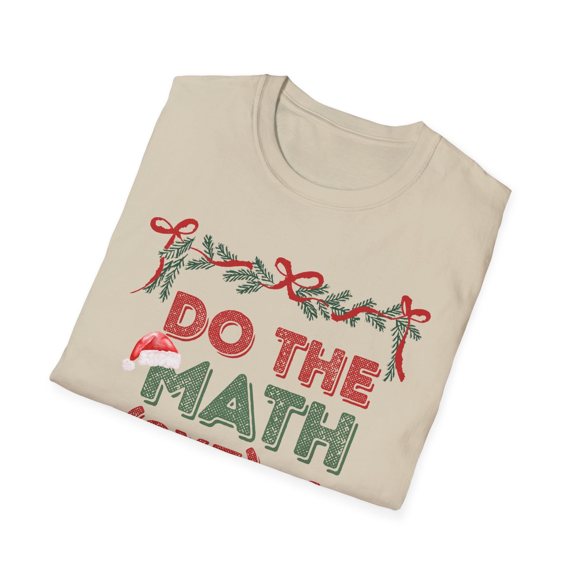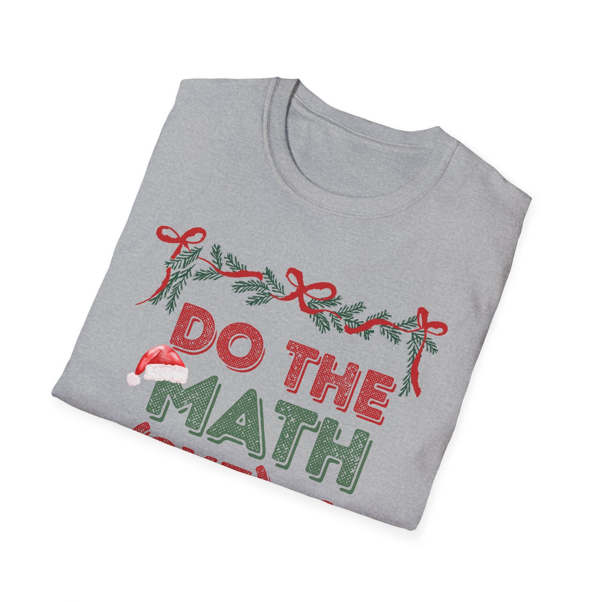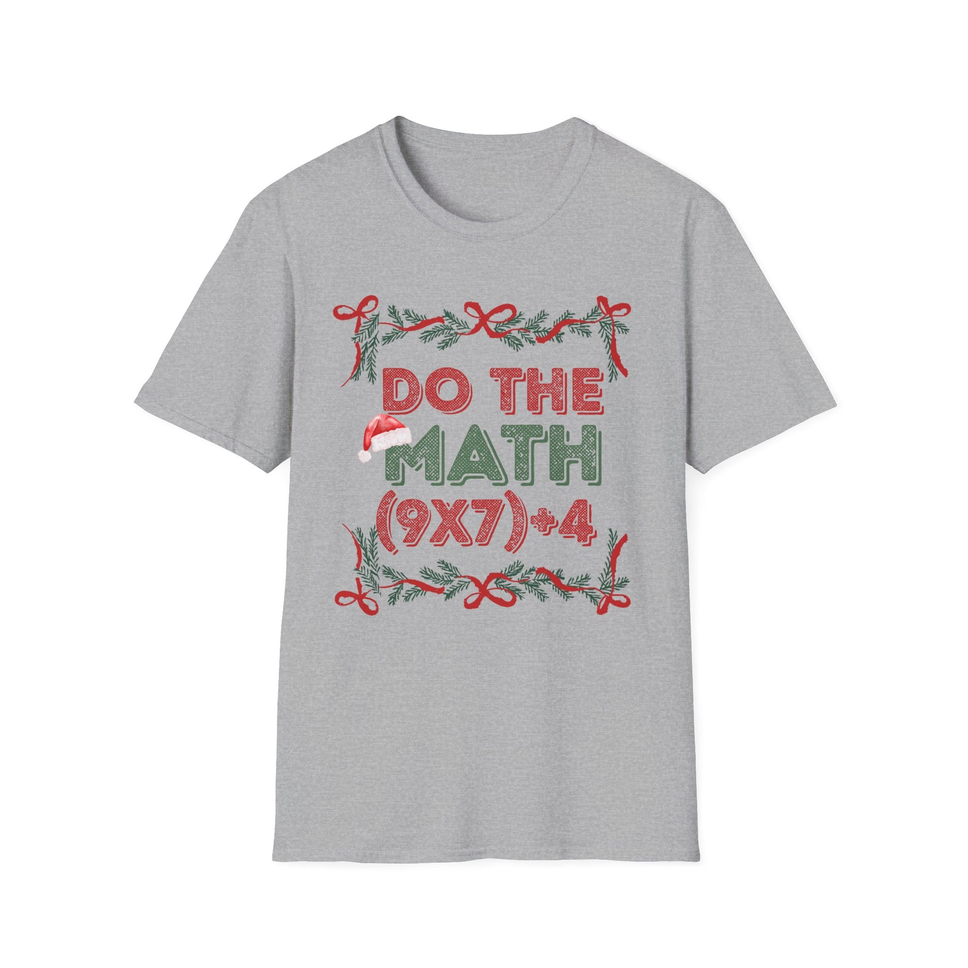 Wearable wit with a seasonal twist — this soft, lightweight tee says “Do the Math (9x7)+4” in cheerful holiday colors framed by candy-cane bows and pine sprigs. It feels airy against the skin and stays shaped thanks to ribbed collar and shoulder tape. Slip it on for casual classroom days, cozy tutoring sessions, or relaxed holiday gatherings where clever humor and low-key festive style belong. The print pops while the shirt keeps things breathable and comfortable all day.